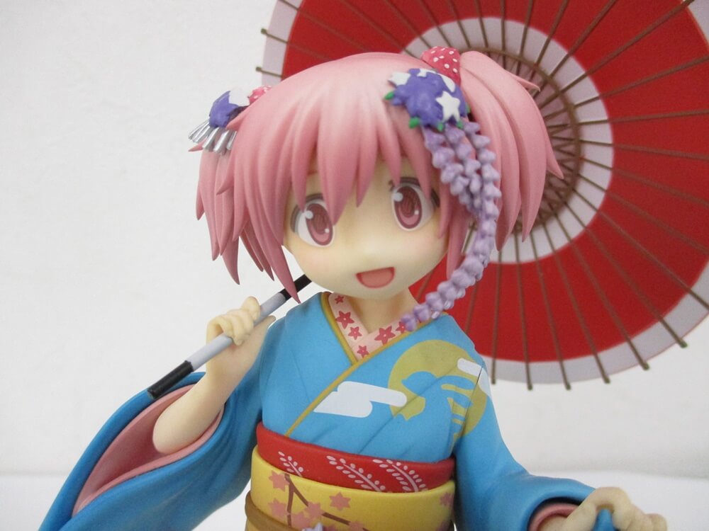 1/8スケールで、舞妓姿で着飾ったまどかが、大きな傘を持ち、艶やかな表情で微笑んでいます。